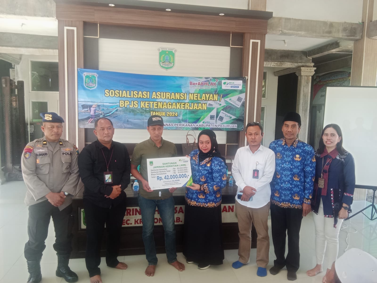 Lebih lanjut, dalam kegiatan ini pula BPJS Ketenagakerjaan menyerahkan santunan secara simbolis kepada ahli waris Alm. Aladin, merupakan seorang nelayan desa Gerongan Kecamatan Kraton yang meninggal dunia sehingga memperoleh santunan Jaminan Kematian (JKM) sebesar Rp. 42 Juta.